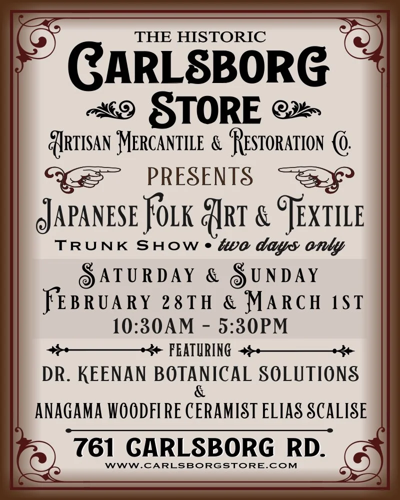 Carlsborg Store will be contributing a selection of new Japanese towels, tea ware, and home decor. Also, inspired vintage clothing, furniture and collectables. We’ll have organic Japanese green teas in stock including new ceremonial matcha varieties, sencha and genmaicha. They’ll be available for tasting and taking home.